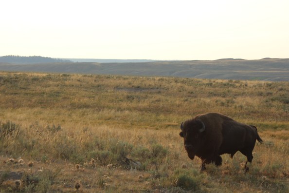 A solitary bison roaming through the fields.