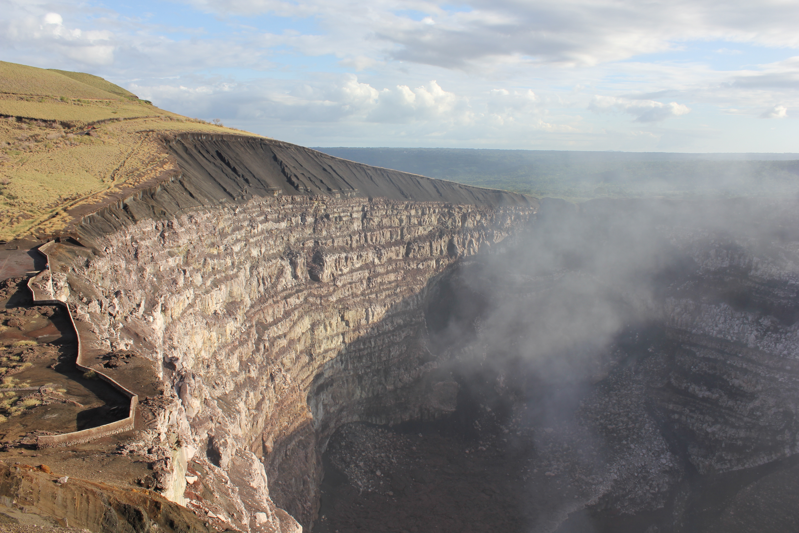 A continuación volvimos a Honduras para cruzar a Nicaragua . Hace poco que Nicaragua acaba de releguir a su presidente exrevolucionario Daniel Ortega y hay carteles y mensajes alusivos al triunfo de la revolución por todas partes. A pesar de parecer un pais muy tranquilo y en el que nos sentiamos por primera vez seguros en mucho tiempo , nos sorprendió que cuando parabamos a comer en la carretera, siempre alguien se acercaba a pedirnos con descaro comida, cosa que nos intimidó mucho. También y a pesar de la lluvia, visitamos las ciudades de Granada y León y el volcán activo de Masaya, donde caminamos alrededor del enorme cráter y acampamos en este parque natural.