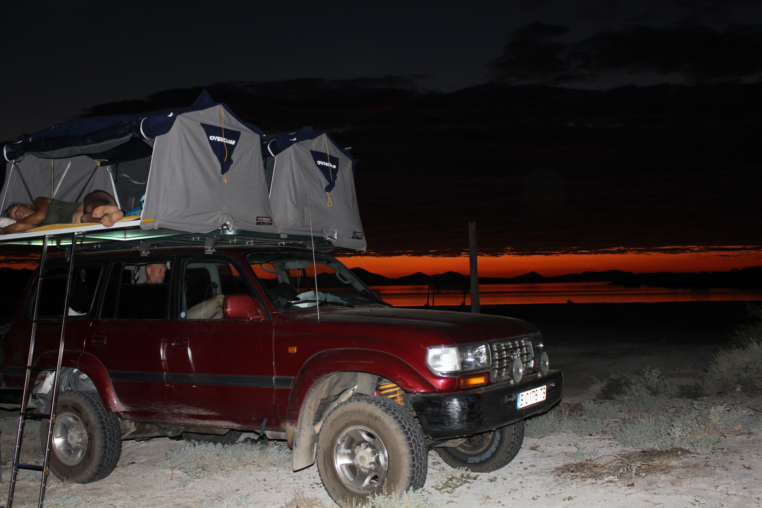 The car is a Toyota HDJ80 Land Cruiser (1997) equipped with a roof tent (OverCamp), a 250 liter water tank, an extra 20 liter diesel tank, an inverter (12V to 220V) and a GPS.