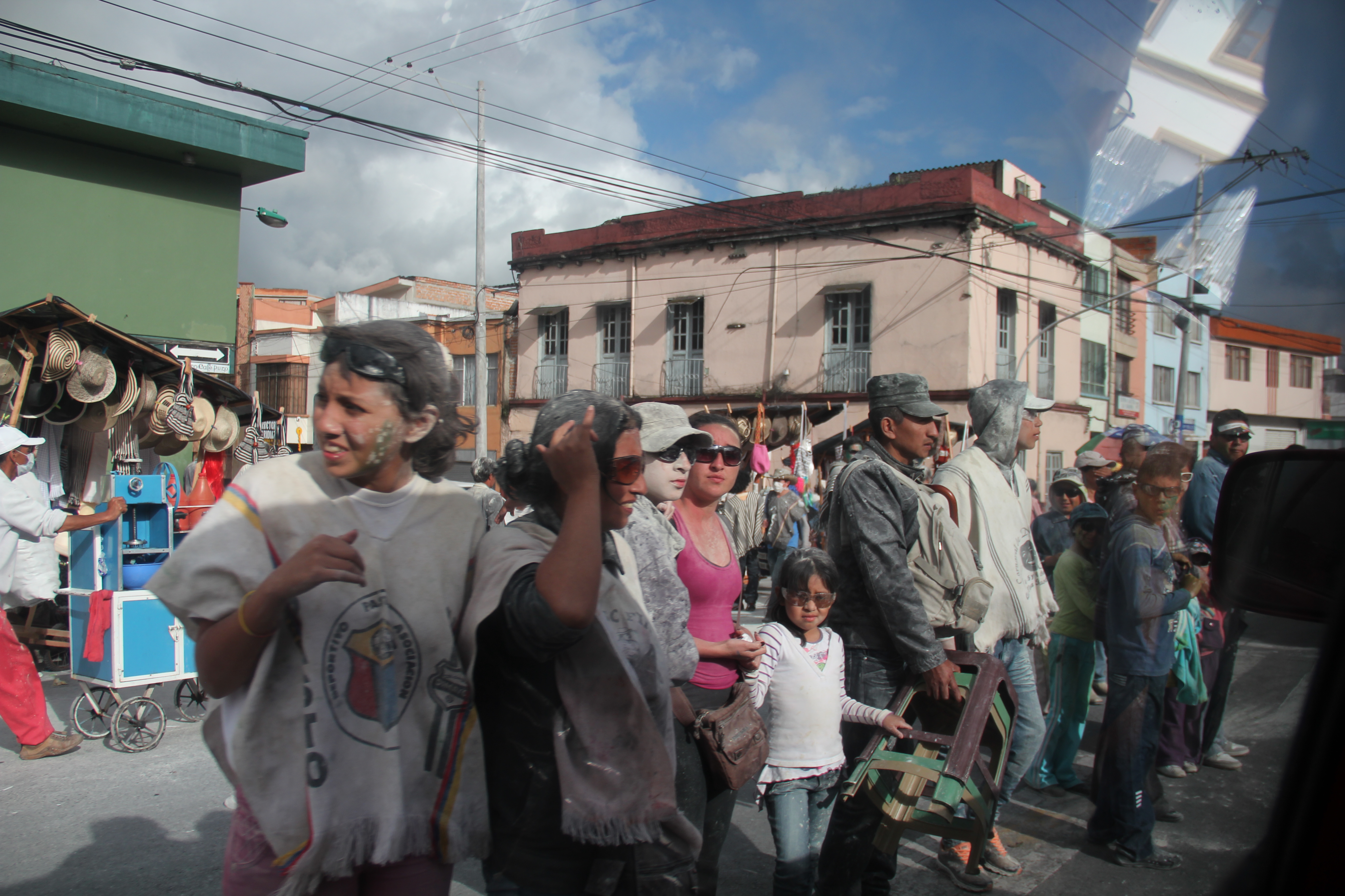 La primera parada que teníamos planeada era en Cali, pero no alcanzamos a llegar esa misma noche a causa de las condiciones de la carretera. Oyvin cayó enfermo con un virus estomacal que tenia afectado a medio Bogotá y Adriana tuvo que comerse literalmente todo el paso por “la linea” (uno de los tramos mas complicados y riesgosos en el mapa de carreteras en Colombia) en medio de la niebla y la lluvia. Nos quedamos en un camping a una hora de Cali y al siguiente día visitamos un poco la ciudad. Seguimos hacia Popayán, donde se celebraba el carnaval de negros y blancos,  fiesta que rememora la tradición de los esclavos de pintarse de blanco un dia  y  al siguiente pintaban a los amos de negros. Así que tan solo entrar en la ciudad el coche se empapó de espuma y talco blanco. Estaban todas las calles inundadas de gente haciendo guerra de pintura negra o de espuma blanca… y no fue menos lo que experimentamos en la ciudad de Pasto el próximo día, la ciudad donde tuvo origen esta tradición. Allí la fiesta estaba multiplicada por dos. Cuando caminábamos hacia el hostal con las mochilas, la gente no llamaba “gringos” y nos atacaban con espuma. Por la noche, Caro, Kristian y yo no perdimos la oportunidad de vengarnos así que salimos a comprar una carioca cada uno y nos adentramos en la batalla campal.