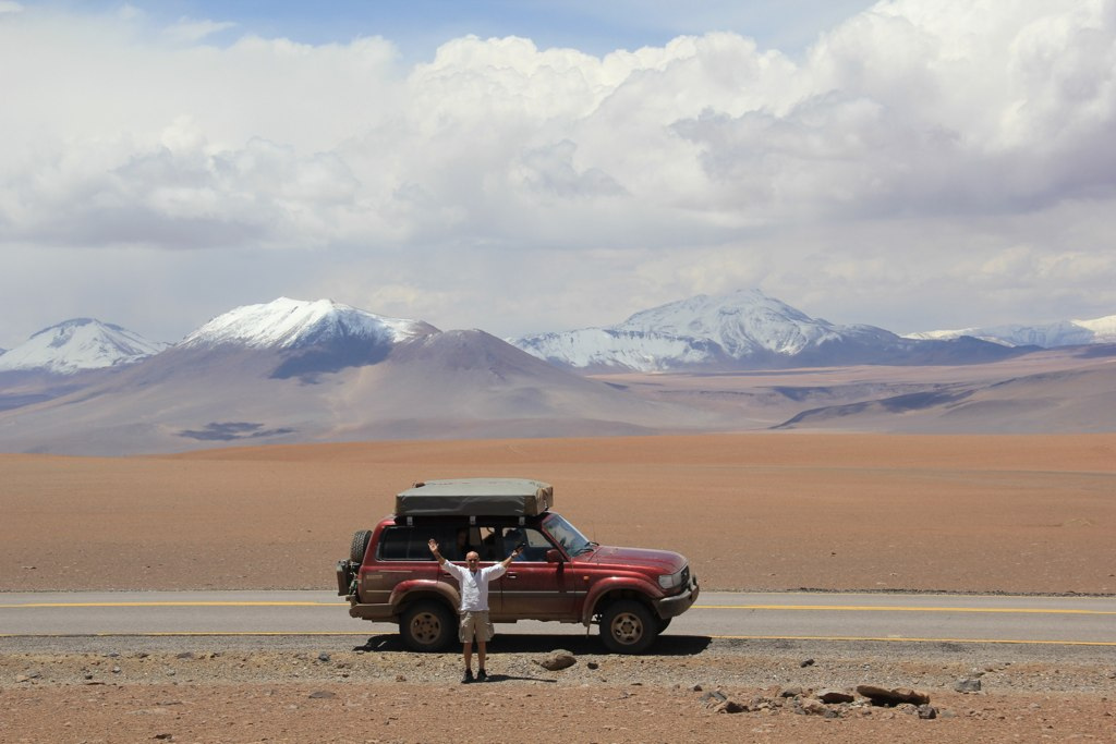Our plan while exiting Oruro was to get to Uyuni in one day, but it’s never wise to plan too much… We got lost and had to drive a whole other day until getting to Uyuni. Once there we had to off course visit the world known Uyuni salar. It was really an amazing place. It almost looked like as if we were on a huge snow field, but was all salt. It had been raining a bit lately so there were big water patches. That is also why it was not possible to cross it to get to Chile; there were some places the water was as deep as one meter. So, in order to get to Chile we had to drive around the salar. We wanted to go past some beautiful lakes as well, but ended up at the border, taking another road without realizing until it was too late…