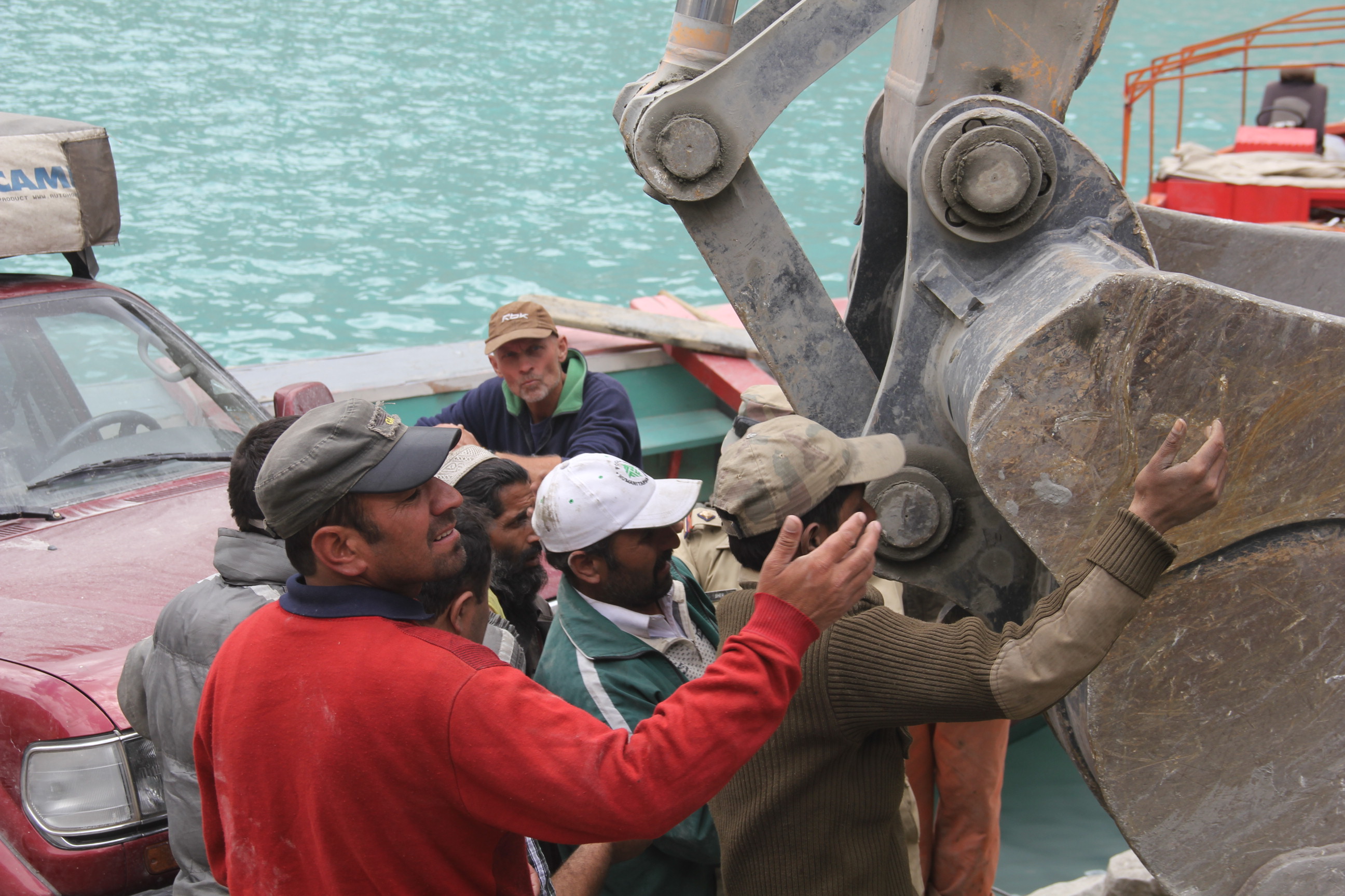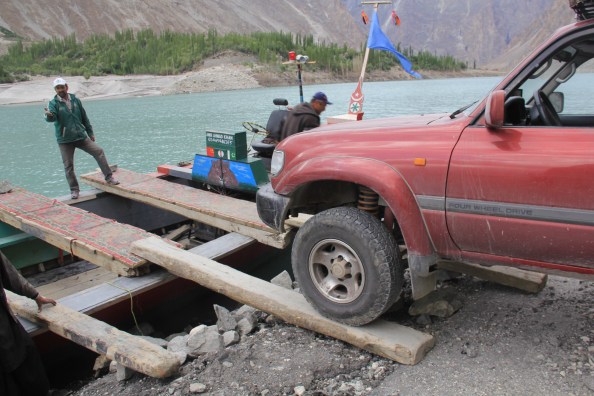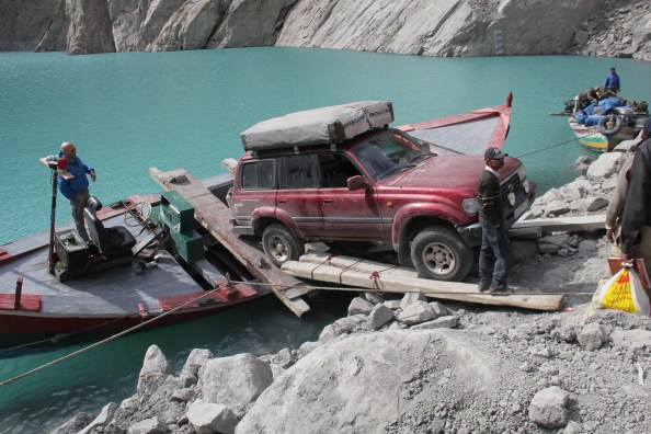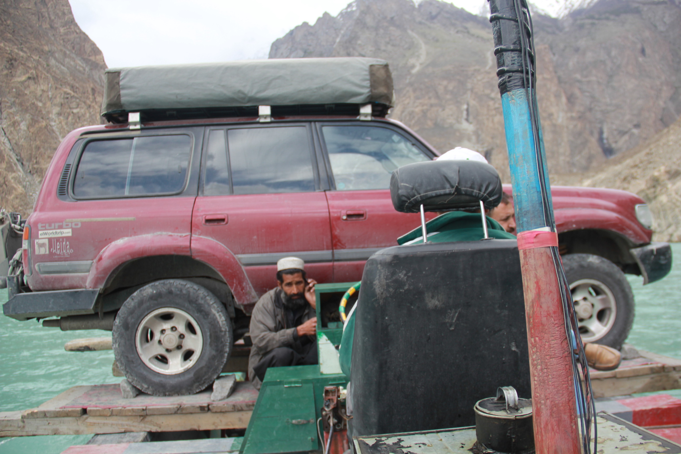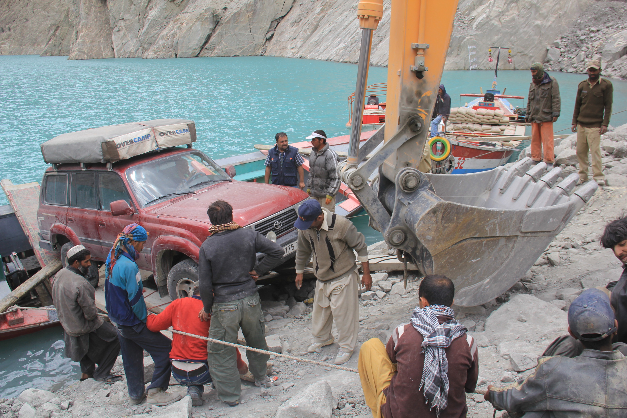 Since part of the Karakoram highway, about 8 km, has disappeared due to a mountain top falling down in 2009, taking half a mountainside with it and creating the huge Abattabad lake (not yet on the maps), we had to ship the car on a small boat.