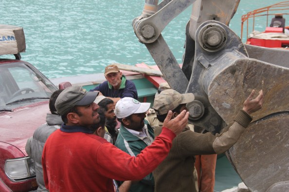 After a lot of discussions, it was concluded that our best option was to seek assistance of a Pakistani-army unit doing maintenance on the road nearby. Assisted by a local police-man and Rias, our Pakistani guide (from “Hunza Explorers” http://www.Tours-Treks.com – a Pakistan based tour company), I managed to catch a ride on a jeep to the closest army storage and borrow some steel-wires. We also fortunately managed to convince an army engineer to assist us with a huge excavator. With steel wires well tied between the car and the excavator to prevent the worst case scenario of the car sliding into the water, I carefully inched forward as the operator of the excavator skillfully pulled me and the car on firm ground.