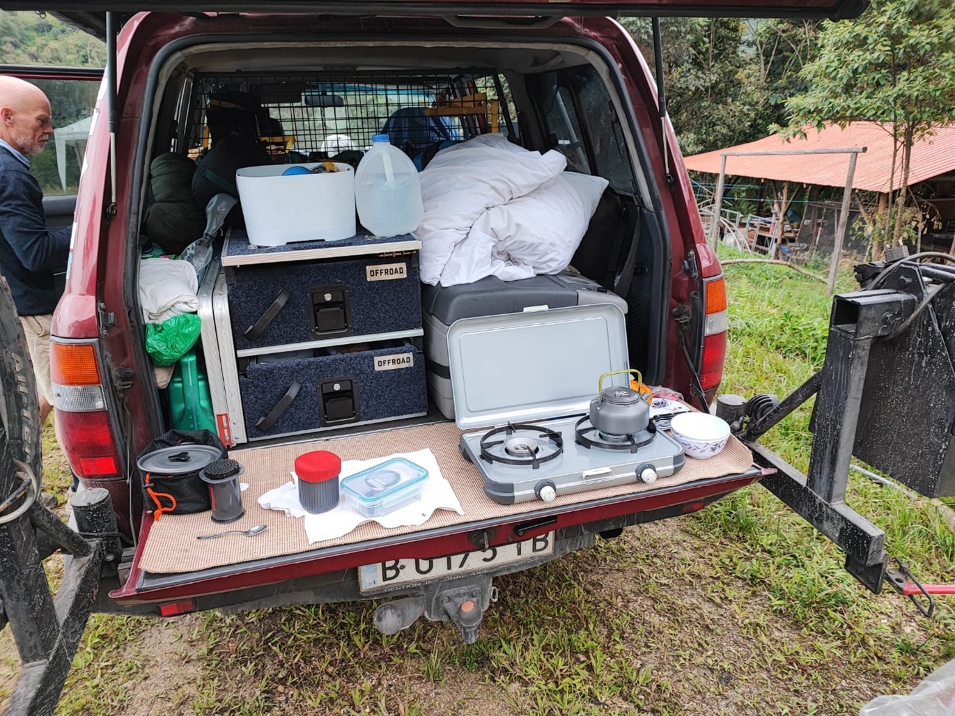 Before leaving Barcelona, Spain, we installed a modern, light, and quick to mount, 2-person roof tent. We also removed the back seats to make room for Black, who now inhabits a roomy area in the mid-section of the vehicle, mounted 2 large drawers, a simple camping kitchen, and a refrigerator in the back. Preparing the 26-years old land cruiser, we also updated the suspension and changed the radiator before leaving Spain and later the clutch before leaving Bogota. We also packed a camping table, 3 chairs, some tools and spare parts including consumables such as engine oil-, brake liquid, diesel- and air-filter. All in all, a quite minimalistic set-up with no luxuries, but still functional with easy access to everything.