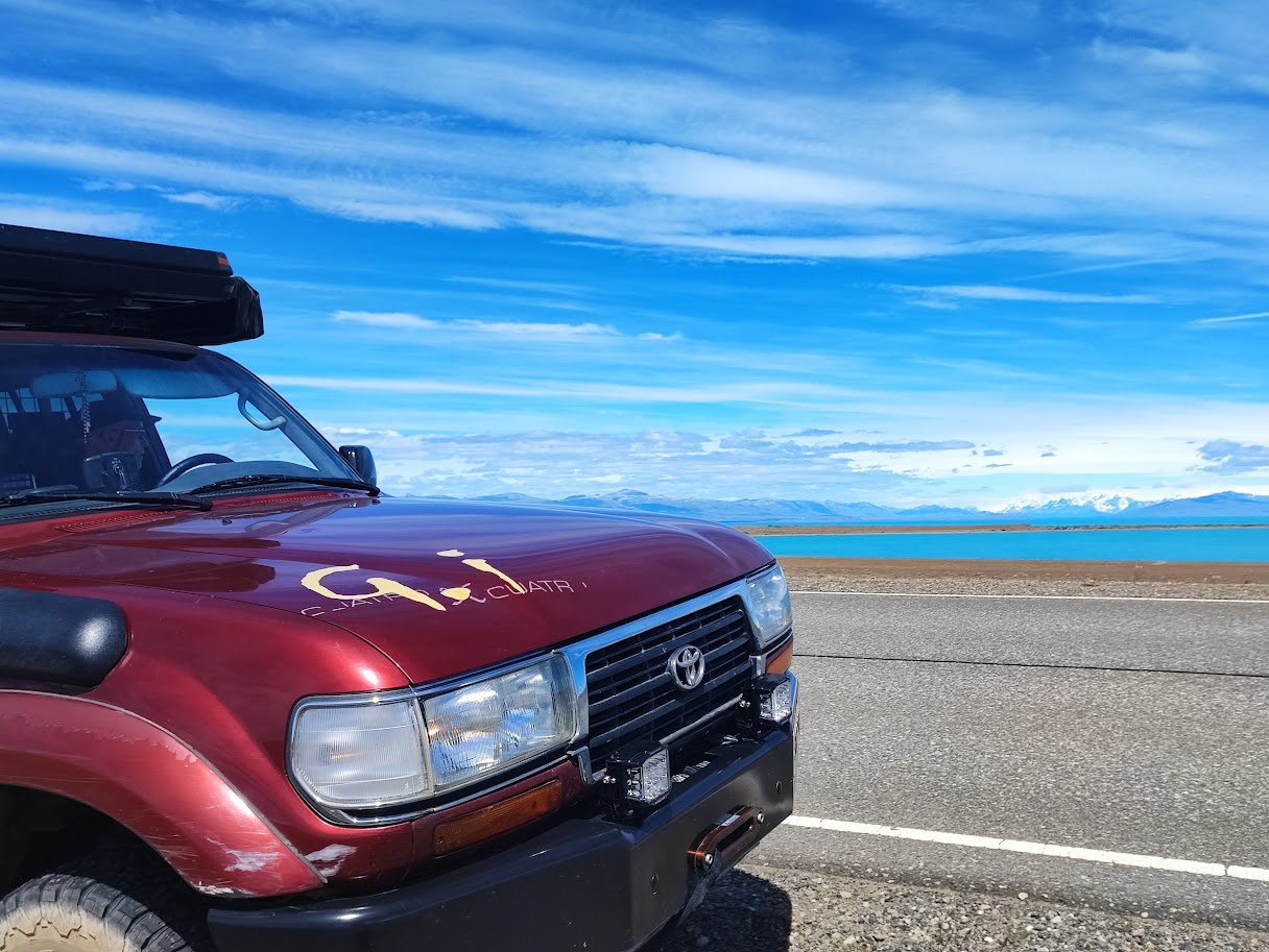The drive from El Cafafate to El Chaltén offered us an incredibly beautiful scenery by mixing the typical Argentine steppe with views of blue-green-grey lakes and white peaks of the Andes in short distance. The famous Route 40 thus gave us all we could ask for and more. More, because it was both warm and sunny, and by miracle also exceptionally calm, i.e. without the traditional Patagonian wind. We arrived after about 230 km, the last 60 or so km with a clear view of the large lake Viedma.