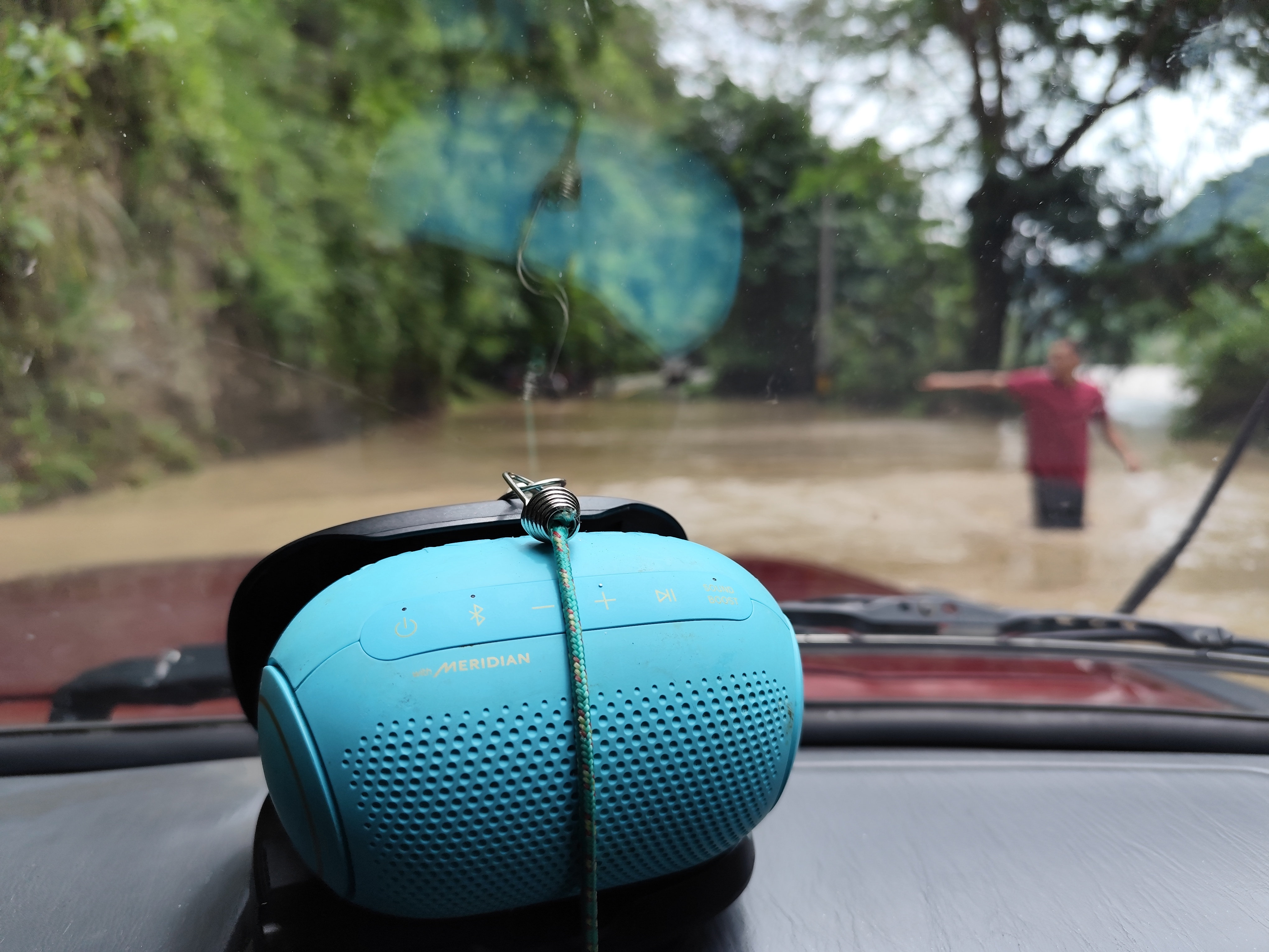 A few kilometers further up the valley, we were stopped by someone signaling and quickly saw a few cars stopped waiting in line. The reason was that the river was overflowing the road several hundred meters ahead. Some “entrepreneurial” youngsters were guiding vehicles across the overflown riverbank with water high up on their thighs. The guides were simply walking through the water showing where the road was supposed to go…